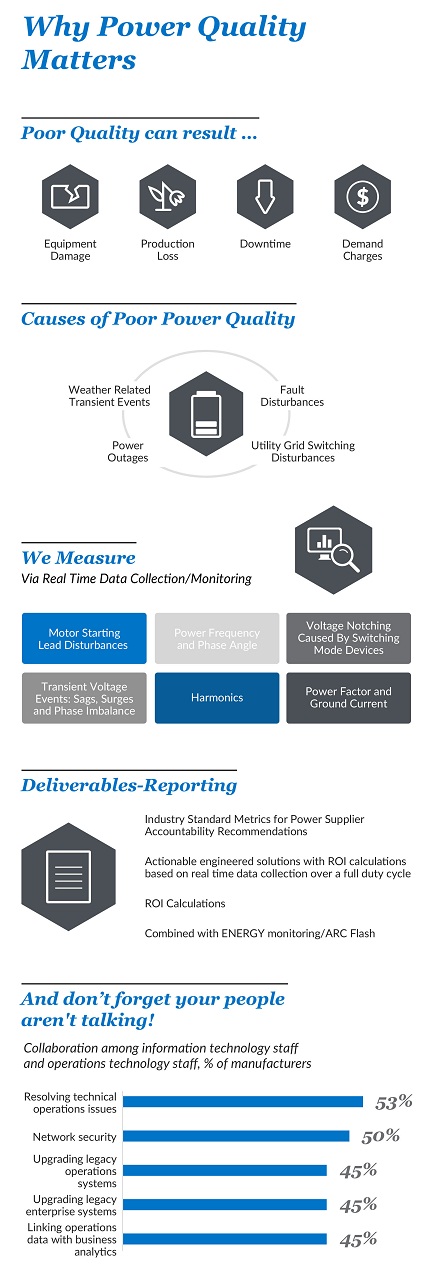 Often important data is orphaned on the plant floor, confined within specific machines. Without the ability to monitor, measure and collect in real time, and interpret this data to the appropriate user need in a recognizable format, this important data is not “monetized” for the organization. Denison’s team currently offers an IEEE standards-based Comprehensive Energy and Power Quality Assessment to assist manufacturers reduce cost and prevent even costlier shutdown due to poor power quality. Typically the approach taken by Denison’s team is offered to serve the needs of power generation firms, not necessarily large users of power, creating a great opportunity to assist manufacturers. With the increasing use of electronics, source and management of high quality power is critical in production.