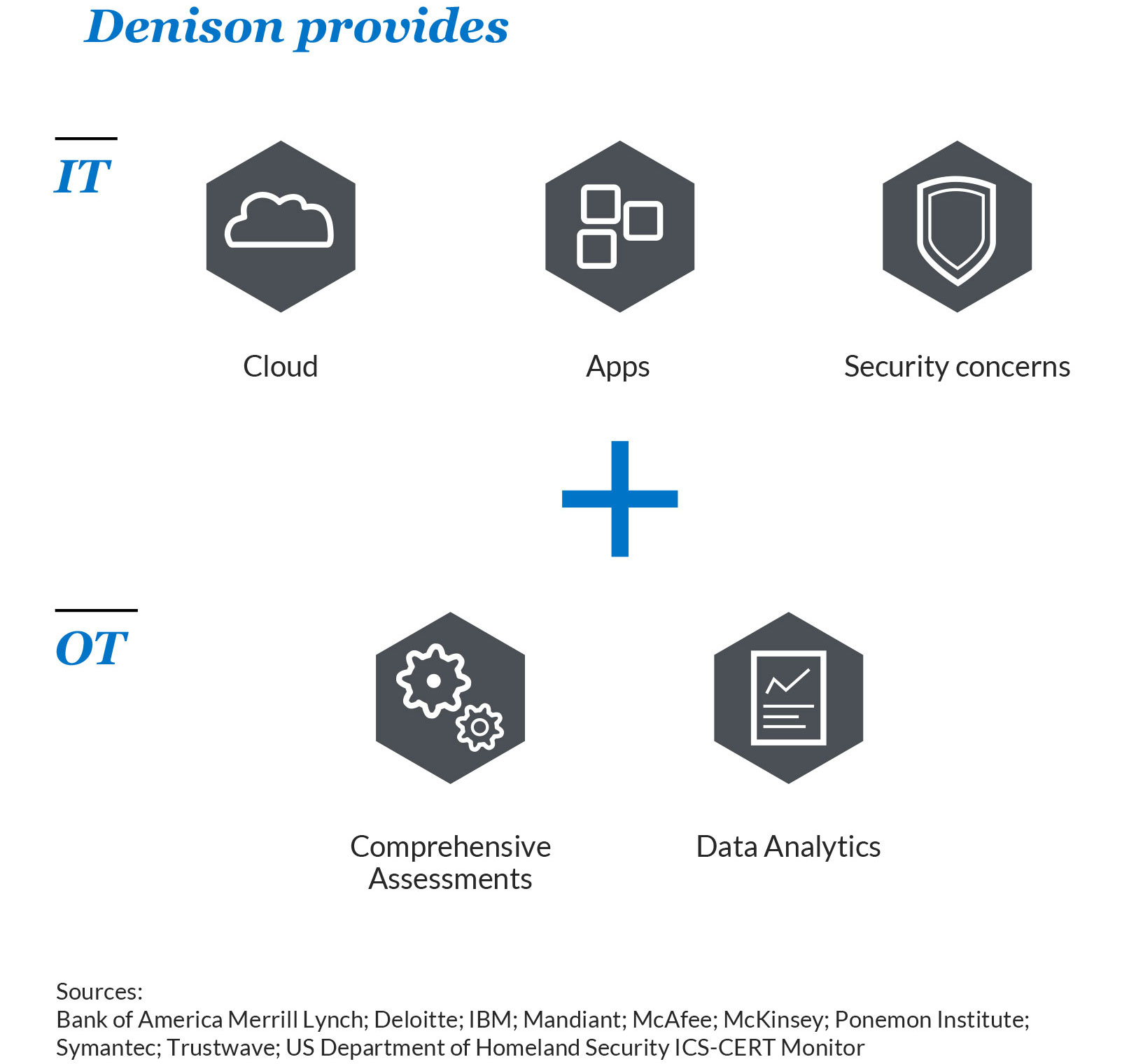 Denison’s team has experience working with large OEMs spanning both the OT and IT landscape—including such names as Rockwell Automation/Allen-Bradley, GE, Siemens, Modicon, Cisco, Juniper, Dell, IBM, Bell Laboratories/Lucent Technologies, Hitachi, HP and others. Additionally, the team is driven to understand how some game-changing technical solutions often delivered by innovative firms can be incorporated into the solution mix.